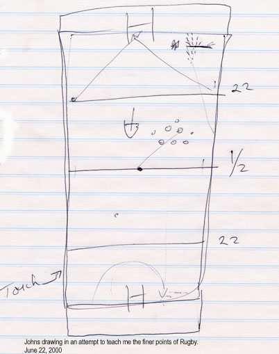 · 2000, June 23: John's map of Rugby as we "watched" the 'All Blacks' on the internet. We attempted to find the game on American TV - but alas - where forced to "watch" a play by play commentator as he typed the game action on the internet. Thought John and I were going to wear out my refresh key!