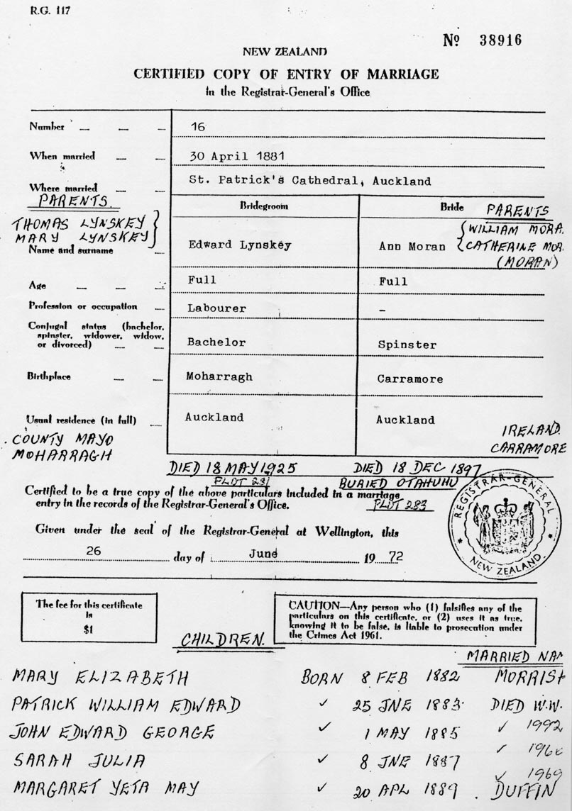 · 1881: Edward & Ann Moran Lynskey, marriage cert