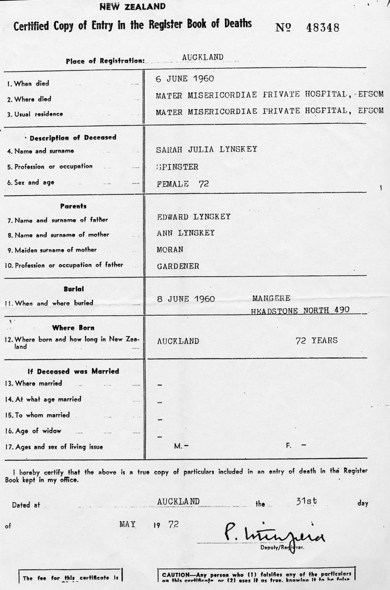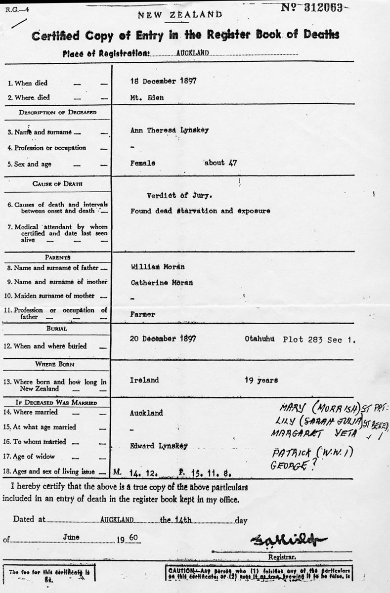 · 1897: Ann Theresa Moran Lynskey, death cert